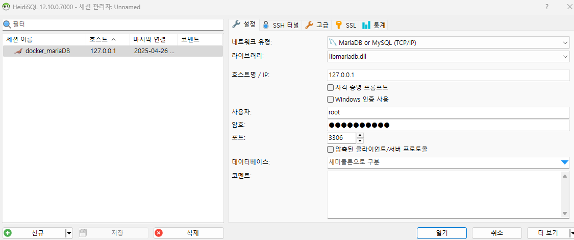 다음 명령어로 MariaDB를 실행합니다 (비밀번호와 포트 설정 필수):